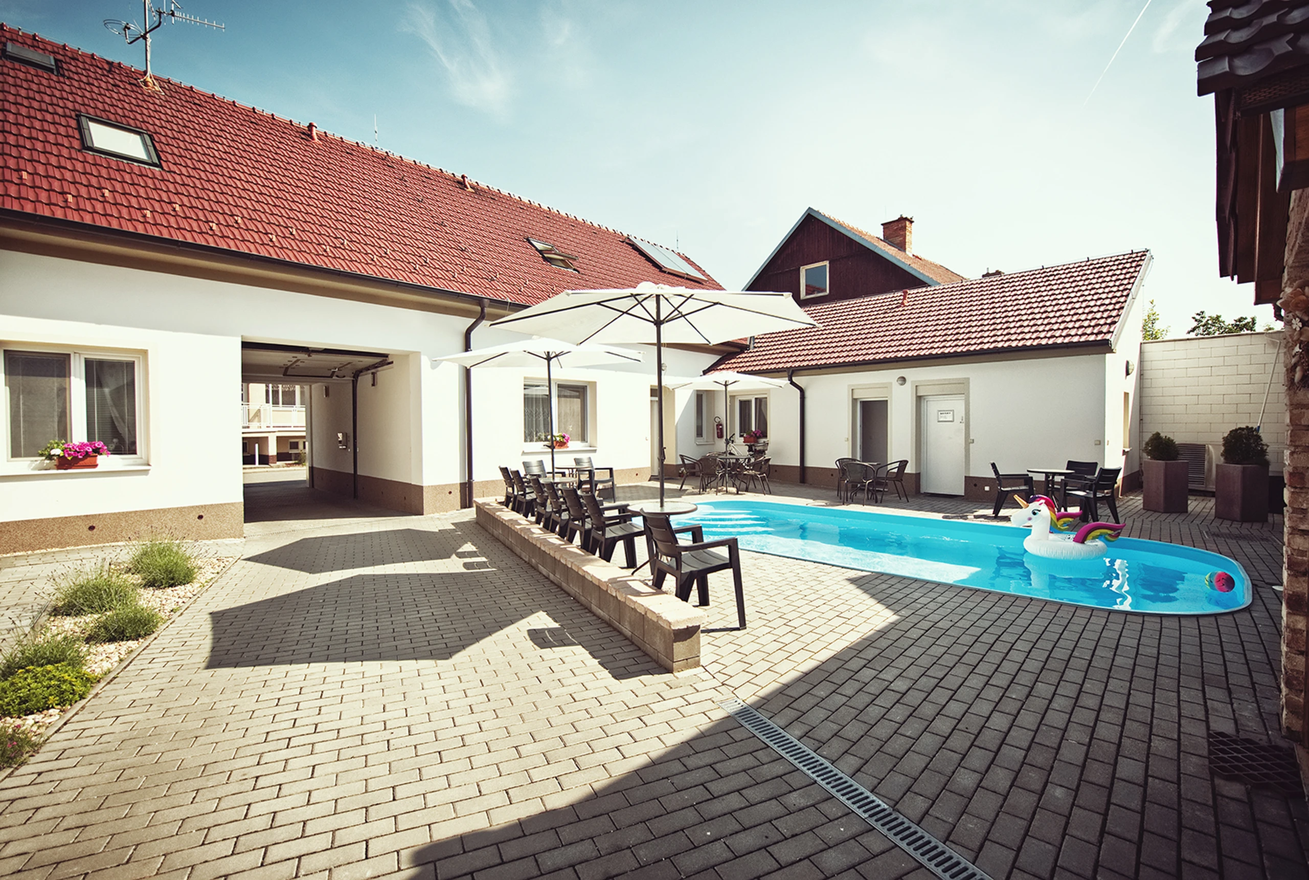 Najdete zde klidné ubytovaní v jedenácti klimatizovaných 2-4 lůžkových pokojích s vlastním sociálním zařízením a televizí. K dispozici je vybavená společná kuchyně a parkovaní v objektu. Pro zájemce je také zajištěno stravování v 100 metrů vzdálené restauraci Praha, kde ochotný personál připraví v době od 8 do 22 hod snídaně, obědy i večeře. Velmi oblíbené jsou také degustace u místních vinařů, které vám rádi domluvíme.